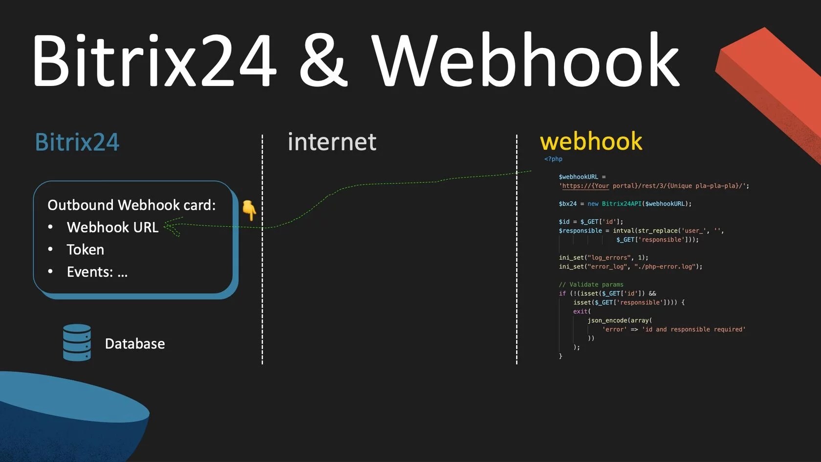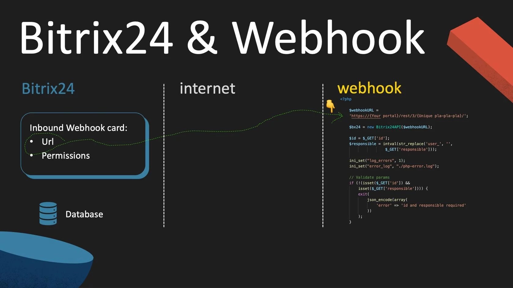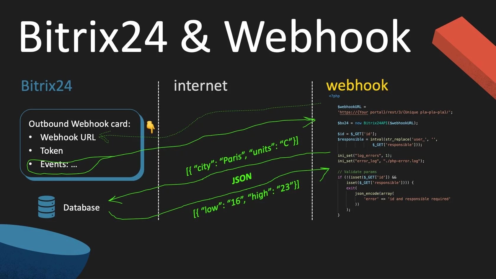 Um webhook nada mais é do que um script hospedado em um servidor que você controla. O Bitrix24 se comunica com esse script por meio de uma URL (como se fosse uma página da web). Ao invés de exibir conteúdo visual, essa “página” executa ações com base nos dados recebidos.