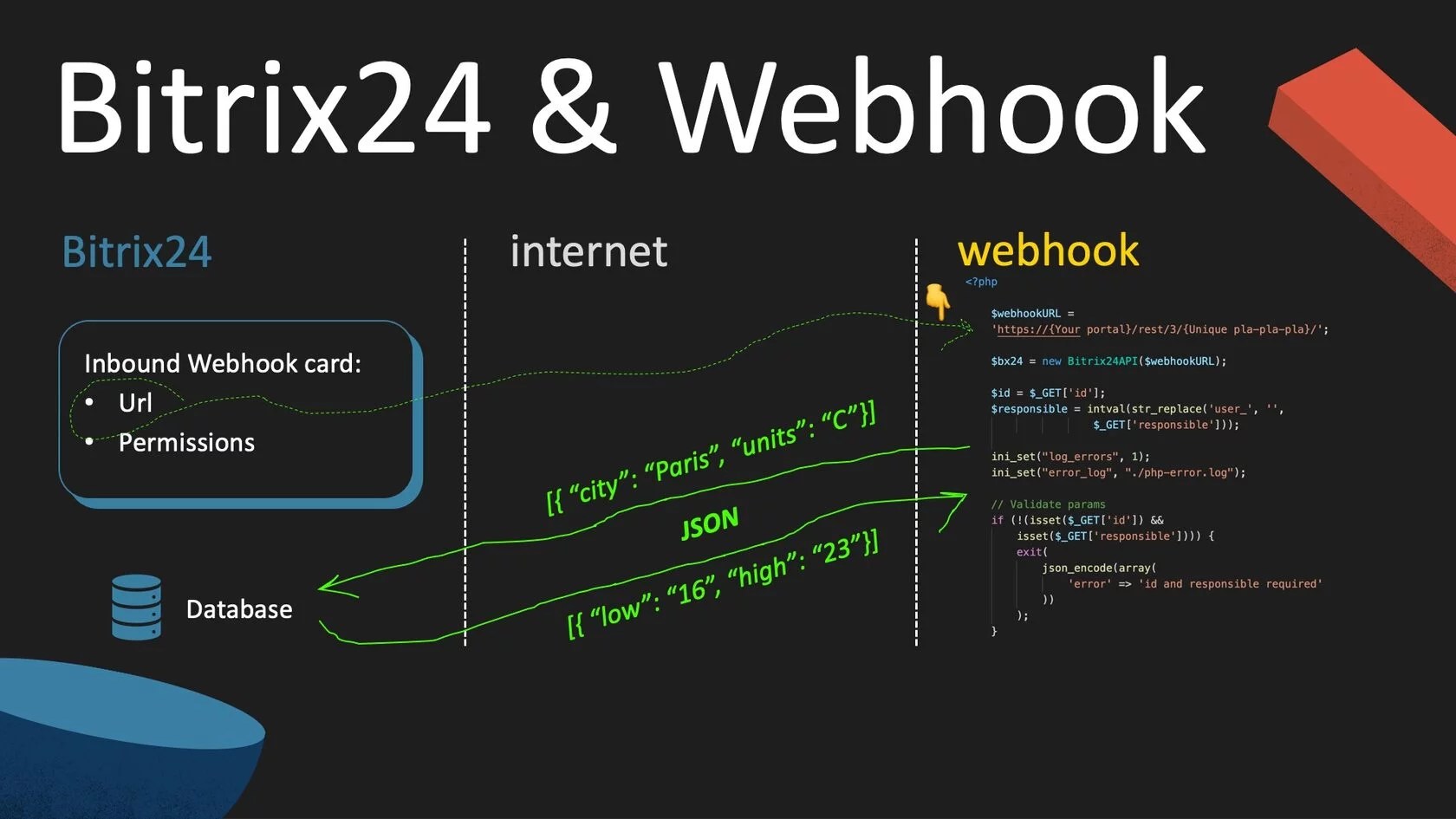 Deixe-me mostrar minha apresentação slide por slide onde descrevo como o webhook e o próprio Bitrix24 e JSON estão trabalhando juntos como uma equipe de Fórmula 1.