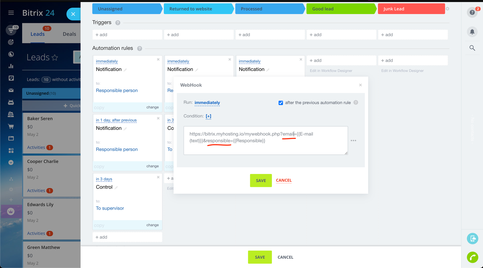 Exemplo: você quer verificar se o e-mail do lead retornado ao seu site é o e-mail “de trabalho” ou apenas algum parecido com o Gmail. Para essa verificação, você preparou um webhook e colocou sua URL na seção “Regras de automação” do seu estágio de pipeline chamada “Retornar ao site”. Você pode adicionar ao e-mail do lead de URL como um parâmetro. Como aqui: